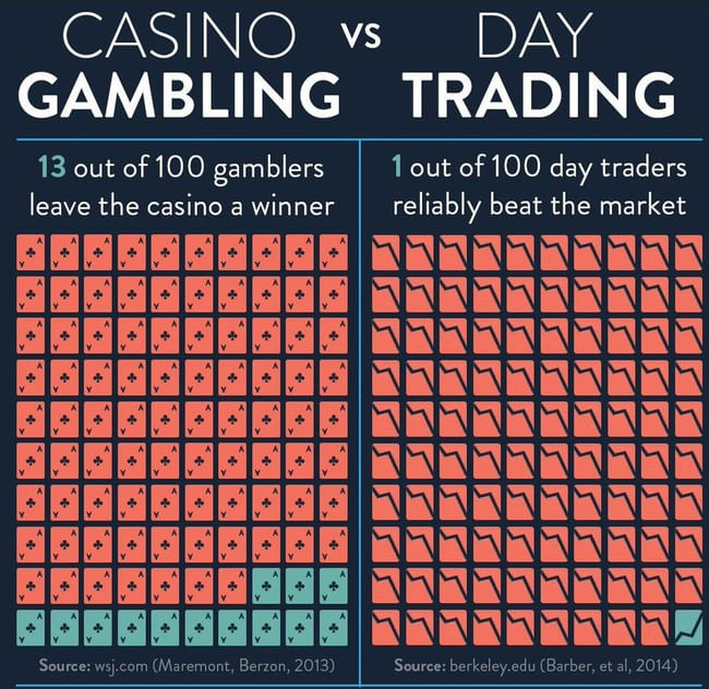 Gambling vs. day trading. Co je výnosnější? Výzkumníci analyzovali výkonnost 18 000 pravidelných hráčů v kasinových hrách, kde se pouze 13 % z nich podařilo během dvou let po sobě něco vydělat. U denních traderů to je dokonce méně než 1 %. Uložte si tento obrázek pro příště, až třeba budete mít chuť na denní obchodování.