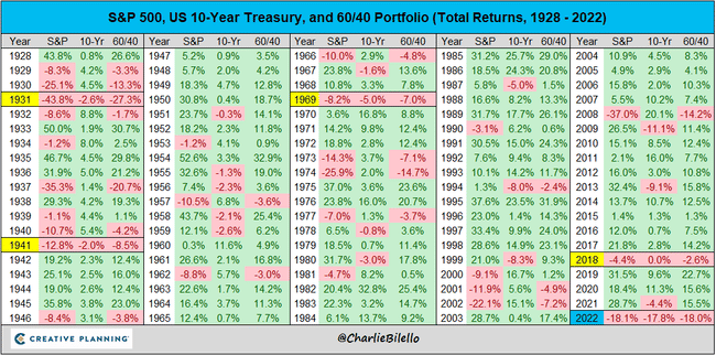 Pamatujete si minulý rok? Výsledkem roku 2022 byl nejhorší rok pro portfolio 60/40 indexu S&P 500 a desetiletých státních dluhopisů od roku 1937 a první pokles obou aktiv o více než 10 %.