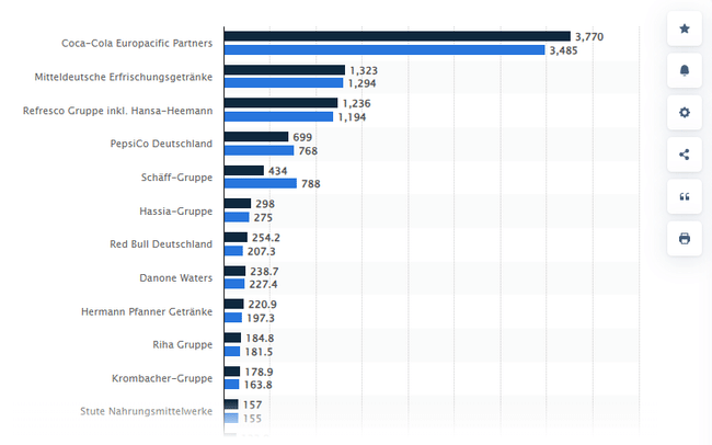 Pro představu přikládám roční objem prodeje předních výrobců nealkoholických nápojů v Německu v letech 2021 a 2022 (data v milionech litrů):