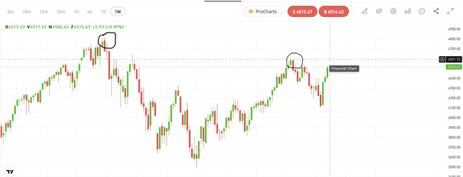 Screen z brokera co používám. Vidíme že se blížíme k vrcholu, který jsme měli kolem poloviny července letošního roku. Pokud překonáme tuto rezistenci, tak už je volná cesta k ATH $^GSPC někde kolem 4800$.