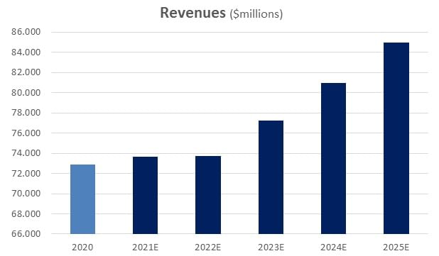 Podle odhadů analytiků se totiž očekává, že tržby společnosti Intel zůstanou v roce 2022 beze změny na úrovni přibližně 73,7 miliardy dolarů a v roce 2023 vzrostou o 3,3 % na 75,6 miliardy dolarů. Poté v současné době existuje pouze jeden analytik, který uvádí prognózy pro roky 2024 a 2025, takže tato čísla nebudu používat a místo toho dám společnosti Intel za pravdu a předpovídám roční růst tržeb o téměř 5 % v každém roce. To znamená, že společnost Intel může do roku 2025 dosáhnout příjmů ve výši přibližně 85 miliard dolarů, což považuji za přijatelný scénář.