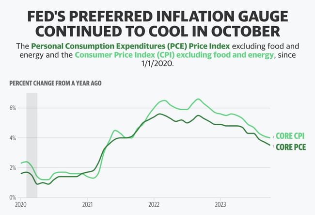 Jádrový PCE dosáhl za měsíc říjen na 3,5 %, což je pokles ze 3,7 % v září a pokračuje v sestupném trendu ze 4,3 % v červnu. Core PCE je jedním z inflačních ukazatelů, který Fed nejvíce sleduje. Investoři nedávno opět navýšili odhady, že Fed s navyšováním už skončil. Dokonce někteří předpovídají snížení během první poloviny 2024.