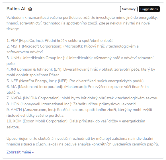 Tak jsem to zkusil a mám drobnou poznámku: K mému překvapení AI navrhuje diverzifikovat moje portfolio akciemi z oborů ze kterých je složeno. Takže druhou ropnou společnost, druhý REIT, druhou banku atd. Čekal jsem návrhy z jiných oborů. Nebo i ETF z jiných oborů.