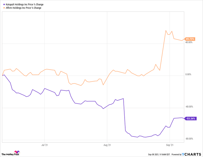 Zdá se, že společnosti Katapult i Affirm mají před sebou zářnou budoucnost ve světě fintech zaměřených na spotřebitele. Tyto dvě akcie se však sotva mohou lišit více. Podívejte se, jak se vyvíjely od doby, kdy společnost Katapult dokončila fúzi SPAC: