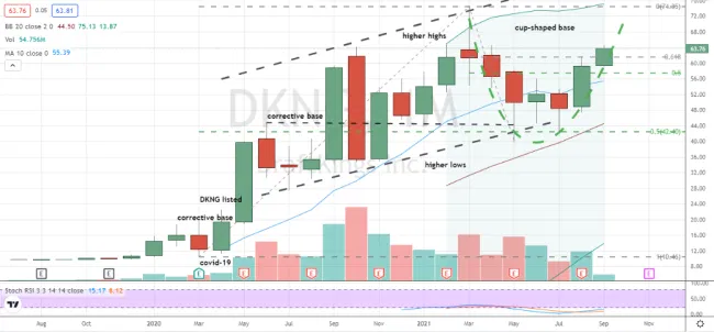 Z technického hlediska $DKNG právě překonala úroveň 62 $ základny ve tvaru poháru a navrátila se na dubnové hodnoty. Vzhledem k tomu, že rezistence se stále nachází vysoko nad současnými cenami a býčí stochastika je nastavena na podporu, je čas na tuto akcii Cathie Wood chytře vsadit pomocí aktivně řízeného listopadového call opčního nákupu 65/75 dolarů.