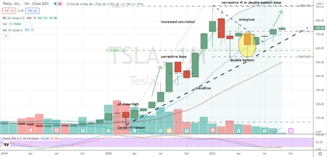 Z technického hlediska je tato akcie podobná našemu dalšímu nákupu od Cathie Woodové. Stejně jako v případě $DKNGse akcie $TSLA obchodují uvnitř horní poloviny korekční báze ve tvaru poháru.