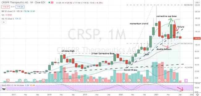 Právě teď však cenový graf naznačuje větší korekční cyklus pro akcie $CRSP, kterého lze krásně využít. Z technického hlediska tato akcie Cathie Woodové sestavila v červenci neúspěšnou měsíční základnu ve tvaru poháru.