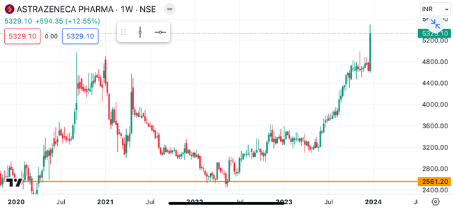 Po delší době jsem se podíval na graf společnosti ASTRAZENECA. Její akcie včera posílily o velmi pěkných 12,55 %.