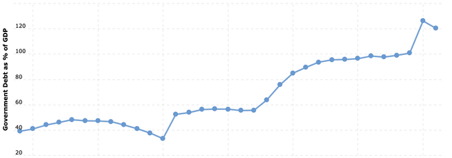 Poměr zadlužení k HDP v USA, zdroj: Macrotrends