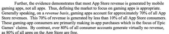 Jak je v rozhodnutí vysvětleno, 70 % příjmů App Store z her pochází od pouhých 10 % všech uživatelů App Store; více než 80 % zákaznických účtů nevytváří "prakticky žádné příjmy" ani pro Apple, ani pro vývojáře.
