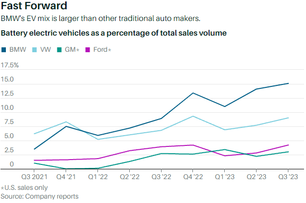 Čo hovoríte na akcie spoločnosti $BMW? Dnes som narazil na graf, z ktorého vyplýva, že v Q3 '23 z celkového predaja aut tvorilo až 15.1% predaj Evs. Čo oproti Q3 '21, v ktorom tvoril celkový predaj len 3.5% vidím ako pekný nárast. Spoločnosť taktiež vypláca 8.43% dividendu, čo je podľa mňa na danu spoločenstvo dosť obstojná divedenda (možno sa mýlim).