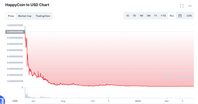 Pokiaľ ide o mňa, minca, ktorú som považoval za legit a s dobrou myšlienkou, bola Happycoin. https://www.thehappycoin.co/ Happy bola darcovská minca, ktorá mala slúžiť na charitu atď. Vedel som, že je v tomto prostredí veľa SCAMOV ale aj tak som investoval asi 120 USD. Happy sa zameral na duševné zdravie a spočiatku sa to zdalo legitímne, keďže dávali na nejaké veci duševného zdravia a investovali myslím 30% do rôznych charít a taktiež tam bol nejaký burning mechanizmus. Robili častokrát aj AMA /ASK ME ANYTHING/, čo mi prišlo celkom legit. Mal som tam zisk vyše 100% aj tak som nevytiahol, pretože vtedy bola MEME season a ja som čakal aspoň 1000%. A takto vyzerá graf.