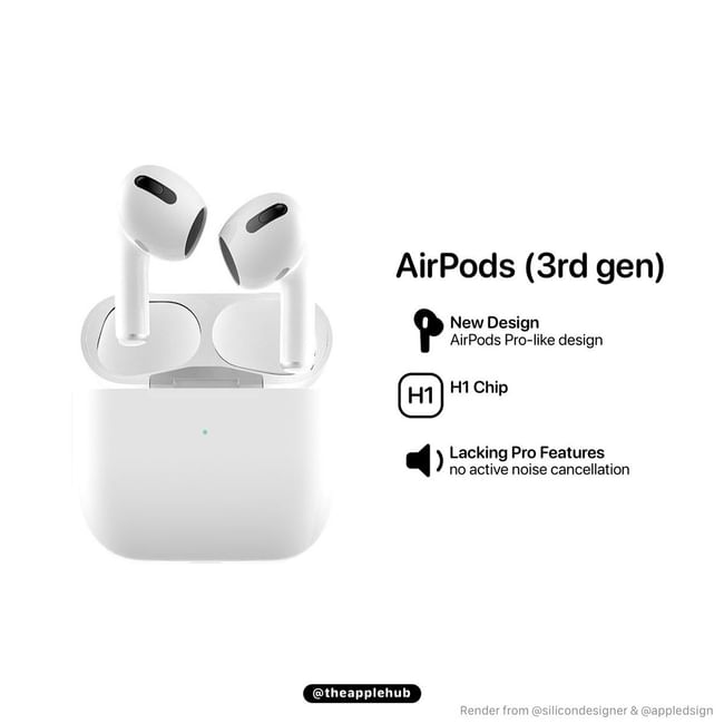 Základní sluchátka AirPods třetí generace prý také čeká změna. První informace z roku 2020 naznačovaly, že design bude vycházet z AirPods Pro, ovšem bez vyměnitelných gumových koncovek sluchátek.