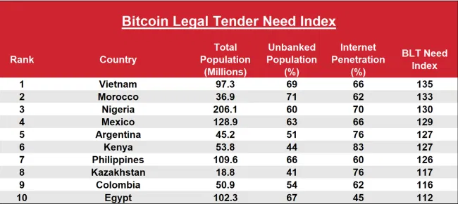 Vietnam v indexu potřebnosti BLT (Bitcoin legal tender) získal první místo. Rovněž získal první místo v globálním indexu přijetí kryptoměn společnosti Chainalysis, což znamená, že Vietnam je země, která by mohla mít velký prospěch z toho, že se bitcoin stane zákonným platidlem, a jejíž občané se těší na to, až se tak stane.