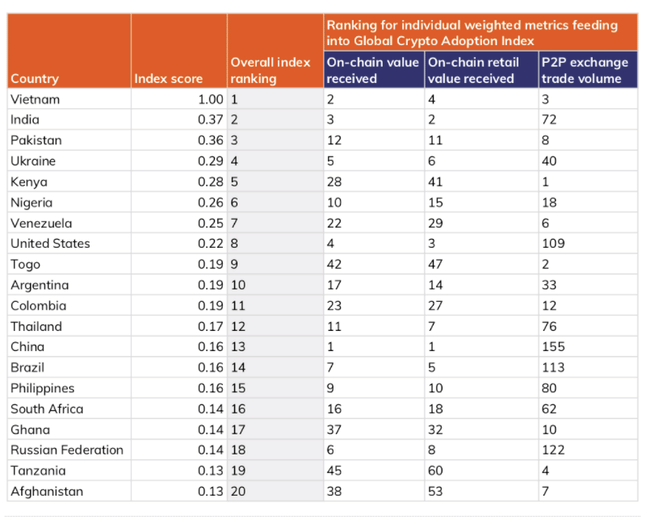 Mezitím se Nigérie umístila na třetím místě prvního indexu potřebnosti a na šestém místě indexu přijetí společnosti Chainalysis. Argentina je na pátém místě našeho indexu potřeb a na desátém místě indexu přijetí společnosti Chainalysis. Keňa je šestá v tomto indexu a pátá v indexu Chainalysis. Filipíny a Kolumbie jsou rovněž v první patnáctce obou indexů.