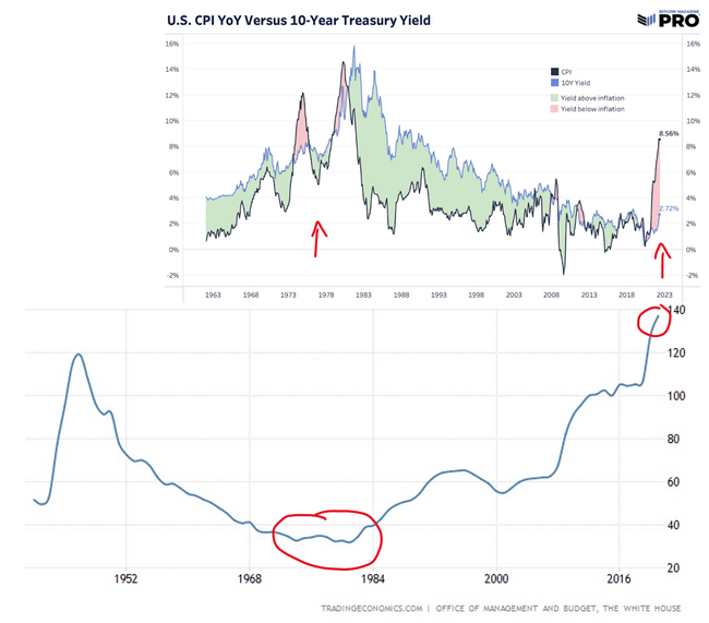 USA v minulosti podobný růst inflace zvládlo zvýšením sazeb o 6 % na 10-20 let (horní graf). Měli ovšem dluh/HDP okolo 30 %, ale dnes mají téměř 140 % (spodní graf). Zvýšení sazeb o 6 % by dnes znamenalo nutnost snížení státních výdajů o více než 50 % nebo další exponenciální zadlužování. Eurozóna má sice průměrnou zadluženost nižší (okolo 95 %), ale máme tu státy, které mají dluh téměř 200 % (Řecko). Více brzy na YouTube: investice Daniel Holánek.
