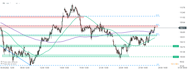 Včera odpoledne dorazily na trhy zprávy, že Německo je připraveno podpořit embargo EU na ruskou ropu. Vzhledem k tomu, že poslední překážka byla odstraněna, očekává se, že brzy padne rozhodnutí. Brent byl však zastaven při 50% retracementu sestupného pohybu zahájeného v polovině března (108,70 USD za barel). Zdroj: xStation