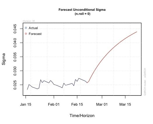 Predpoveď modelu GARCH naznačuje zvýšenie volatility akcií BBW počas nasledujúcich 30 dní. Predpoveď ukazuje relatívne stabilnú volatilitu na začiatku, po ktorej nasleduje výrazný rastúci trend, keď sa posunieme ďalej v horizonte. Pre investorov to naznačuje, že cena akcií spoločnosti BBW môže v nasledujúcom mesiaci zaznamenať väčšie výkyvy, čo by mohlo znamenať vyššie riziko investície v tomto období.