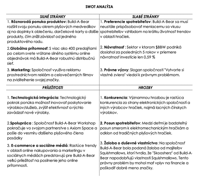 Súhrnne povedané, komplexná analýza spoločnosti Build-A-Bear Workshop (BBW) vystihuje spoločnosť, ktorá úspešne diverzifikovala svoj sortiment výrobkov nielen na plyšové hračky, ale aj na odevné doplnky a iný tovar, čím znížila svoju závislosť na jednej kategórii výrobkov. Spoločnosť sa môže pochváliť významnou globálnou prítomnosťou s robustnou platformou internetového predaja a fyzickými predajňami na viacerých kontinentoch, čo prispieva k silnej distribučnej sieti.