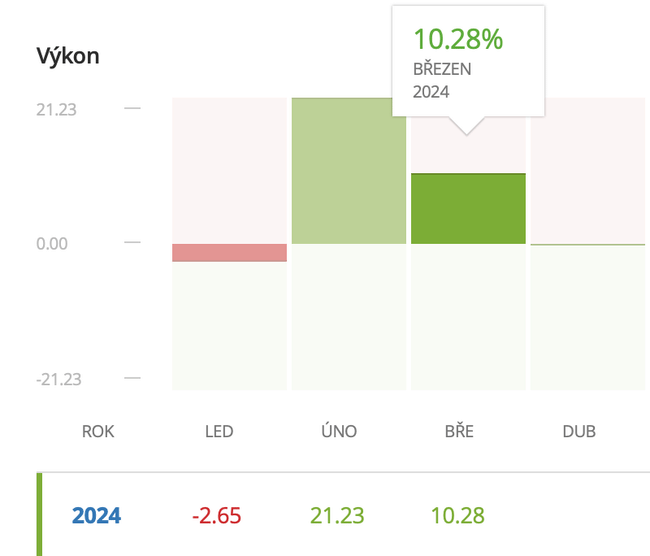 Super výsledek a gratuluji. Přesné čísla a % neznám, ale též jsem tam v zisku. V dubnu toho zatím moc neplánuji, spíše se budu držet dál a nic moc nekupovat.