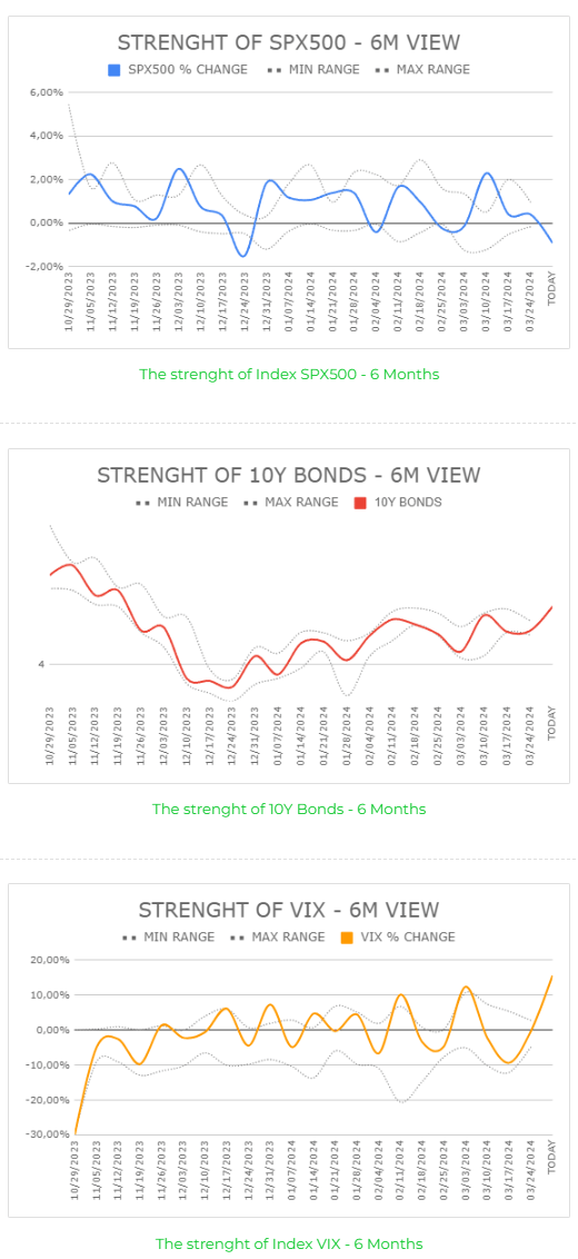 dnes jen čistě fakta od cca 11/2023. Na prvním grafu můžeme sledovat aktuální výnosnost indexu SPX500, která se ponořila lehce do záporných hodnot. Takže už se nebavíme o výnosu, jsme kolem -1% v tomto týdnu. Bohužel také můžeme sledovat od poloviny prosince 2023 zvýšení výnosů na dluhopisech (graf 2). Co se mně ale vůbec nelíbí, je na 3. grafu přímo kmitna indexu volatility, která v posledních týdnech nabírá silně na intenzitě.