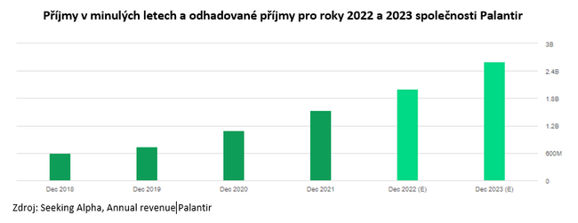 Na následujícím grafu lze vidět, jak Palantiru každoročně rostou příjmy a v letech 2022 a 2023 opět odhadují nárůst. V roce 2022 konkrétně o půl miliardy dolarů a v 2023 o více než miliardu dolarů v porovnání s rokem 2021.