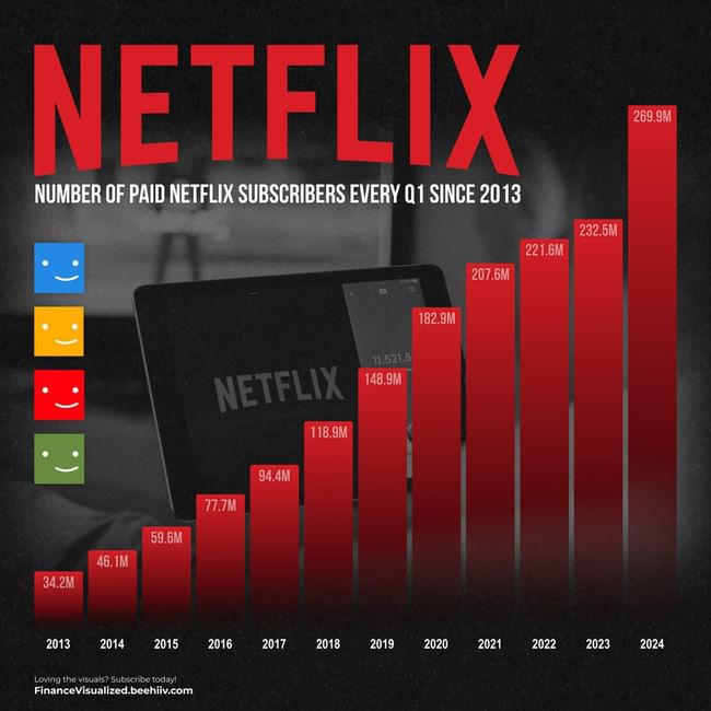 Historie předplatitelů Netflixu $NFLX každé 1. čtvrtletí od roku 2013. Zaznamenal Netflix svůj peak a nyní už to bude pouze udržovat či ztrácet, co myslíte?
