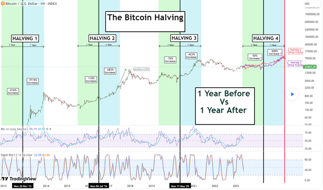 Ač nejsem rozhodně příznivcem $BTCUSD, ale vastním ho, nejsem ani zastáncem TA, tak jsem včera narazil na graf, který je vyloženě sestaven na základě dat minulých a pro mě osobně je zajímavý, dovolil bych si říci, že mu přikládám stejnou váhu jako schválení ETF na BTC. To znamená, že nám rozhodně nic neslibuje v "posthalvingovém" období. Ano, namítnete, že je vše již v ceně započítané, neříkám, že není, na druhou stranu proč by to tam nebylo již po minulém - 3. halvingu :) Je na každém z nás jak s tím naložíme, ale já se musel podělit :)