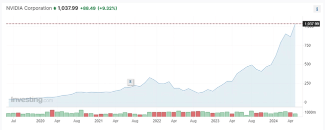 Celkové příjmy společnosti NVIDIA za první čtvrtletí fiskálního roku 2025 (období od 29. ledna do 28. dubna 2024) činily 26 miliard dolarů, což je meziroční nárůst o 262 %. Konsenzuální očekávání tržeb bylo na úrovni 24,7 miliardy USD. Tyto příjmy byly masivně podpořeny zejména příjmy z datových center, které dosáhly historického maxima 22,6 miliardy USD, což je o 427 % více než ve stejném období loňského roku. Aby toho nebylo málo, čistý zisk společnosti vzrostl oproti 1. čtvrtletí fiskálního roku 2024 o 628 % na 14,9 miliardy USD a čistá zisková marže činila neuvěřitelných 57 %, což je pro tak obrovskou společnost, jako je NVIDIA, nebývalé číslo. Jen pro srovnání, čistá zisková marže Microsoftu za poslední čtvrtletí činila přibližně 35 %, zatímco marže Applu dosáhla 26 %. Finanční výhled společnosti NVIDIA na příští čtvrtletí rovněž překonal očekávání - společnost stanovila předpokládané tržby na 28 miliard dolarů, zatímco odhady analytiků hovořily o zhruba 26,7 miliardách dolarů. [1] V návaznosti na tuto zprávu překonaly akcie společnosti NVIDIA hranici 1 000 USD.* Kromě toho společnost také oznámila rozdělení akcií v poměru 10:1, které vstoupilo v platnost 7. června tohoto roku.
