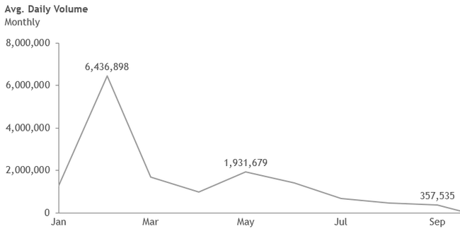 Jednoduše řečeno, čím nižší je objem obchodů s danou akcií, tím více je cena odtržena od reality. To je do značné míry případ společnosti $CHAL. V současné době je v oběhu zhruba 59,1 milionu akcií, což činí tržní kapitalizaci 45 milionů kanadských dolarů nebo 35 milionů amerických dolarů. To není obrovský float, nicméně historický objem se v průměru obchoduje s 2-6 miliony akcií denně (což je minimálně 3-10 % objemu akcií bez započtení nových emisí). Jak můžete vidět na grafu níže, průměrný denní objem obchodů se snížil na 360 tis. z 6 437 tis. před pouhými 8 měsíci (nebo je běžně udržitelnější 1-2 mil.). Od tohoto měsíce činí denní objem obchodů ~0,6 % objemu akcií v oběhu, což je neuvěřitelně nízké číslo.
