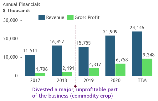 Čísla do značné míry hovoří sama za sebe; společnost v posledních několika letech neuvěřitelně rostla, a to i navzdory tomu, že se v roce 2019 zbavila velké, málo ziskové části svého podnikání. Navzdory zdánlivě stabilním tržbám, jak můžete vidět, hrubý zisk vzrostl z 1,7 mil. dolarů v roce 2017 na dnešních 9,3 mil. dolarů, což představuje ~63% CAGR hrubého zisku od roku 2017. Ačkoli je vzhledem k odprodeji těžké provést srovnatelný výpočet tržeb, za posledních 18 měsíců vzrostly tržby z 15,8 mil. na 24,1 mil. dolarů, což znamená ~33% CAGR tržeb od roku 2019.