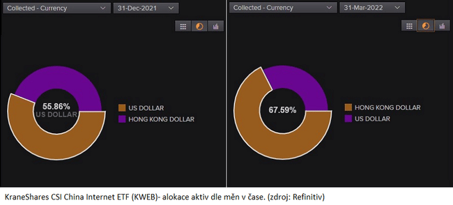 Trend můžeme pozorovat i v případě burzovně obchodovaných fondů (ETF) na čínské akcie. Společnost Krane Funds Advisors, která má na svědomí jeden z největších nástrojů na tamní internetové firmy (KWEB), postupně přeskupuje své pozice z NY do HK. Dle vyjádření z dubna chtějí ve svých fondech v následujících měsících držet pouze běžné akcie. Dle dat z Refinitiv byly na konci roku 2021 aktiva fondu ze 44,14 % nominovány v HKD. Na konci března už to bylo 67,59 %. Fond ve správě drží necelých 6 mld. USD (5,925), nejedná se tedy o žádné drobné. V ETF na čínská ADRs by měl být celkově majetek v odhadované výši 37 mld. USD. Největší správci aktiv jako je MSCI nebo S&P Dow Jones celou záležitost zatím nekomentovali. Cena aktiv je ale určována nabídkou a poptávkou. Pokud někdo na jedné straně sype obrovské množství akcií, na cenu to musí mít vliv.