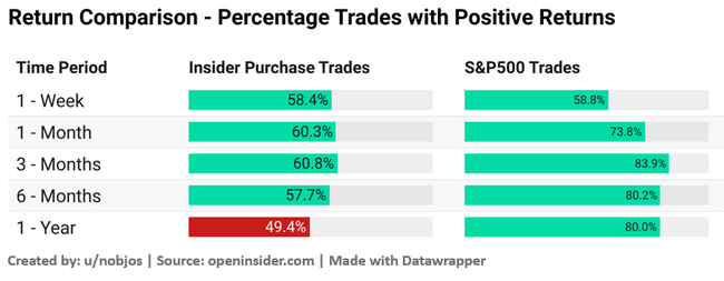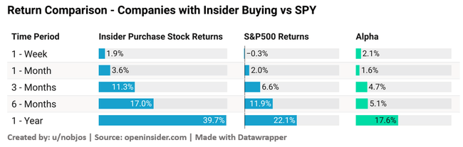 V následující analýze, kterou jsem našel na internetu se podíváme, jestli můžete porazit trh, pokud budete sledovat nákupy akcií prováděné insidery společností. V analýze je analyzováno více než 4000 insiderských obchodů uskutečněných za poslední 4 roky a ty jsou následně porovnány s indexem S&P 500 $SPX. Zde jsou výsledky.👇