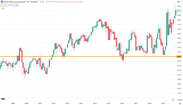 Tento rychlý nárůst ceny se samozřejmě neobešel bez dělení akcií. $QCOM dělil své akcie celkem 2x. Nejprve v poměru 2/1 a následně na…