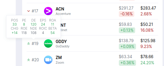 Zároveň při najetí na tuto šipku vyjede box, ve kterém okamžitě vidíte jednotlivé metriky, ze kterých pořadí vychází a zároveň barevně znázorněno to, zda se firma v těchto metrikách v daném období zlepšila či zhoršila.