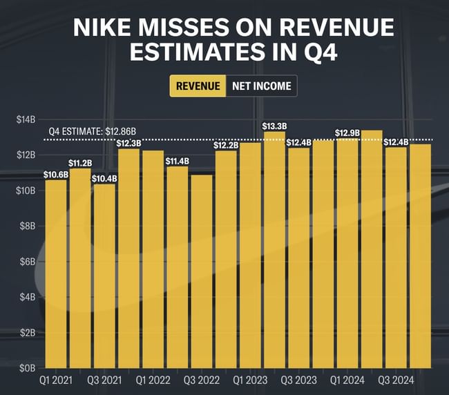 $NKE Společnost ve čtvrtek uvedla, že očekává, že tržby v roce 2025 klesnou o střední jednociferné hodnoty. Akcie směřují k nejhoršímu jednodennímu propadu od roku 2001. Společnost uvedla, že čtvrtletní tržby ve čtvrtém čtvrtletí klesly o 2 % oproti předchozímu roku na 12,61 miliardy dolarů, pod odhady Wall Street ve výši 12,86 miliardy dolarů.