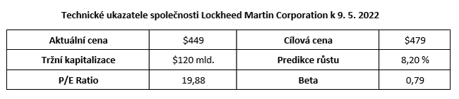 Díky technickým ukazatelům lze vidět, že aktuální cena se blíží odhadované cílové ceně, nicméně v současné situaci tento fakt nelze brát až tak vážně kvůli nenadálé události na Ukrajině a tím razantně zvýšené poptávce po zbraních a celkové obraně. Velkou výhodou $LMT je nízká volatilita vůči trhu, která je dle technického parametru Beta o 21% nižší než samotný trh. Obrovská tržní kapitalizace není u tak světové firmy žádným překvapením.