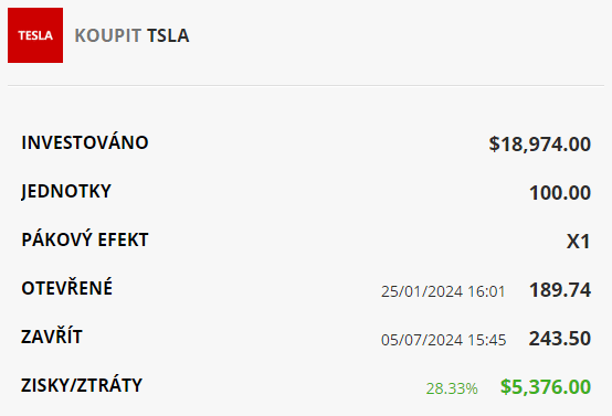 Já mám aktuálně pěkných 69 otevřených pozic v Tesle, 32% zisk, procentuální zatížení v portfoliu 100% 😁