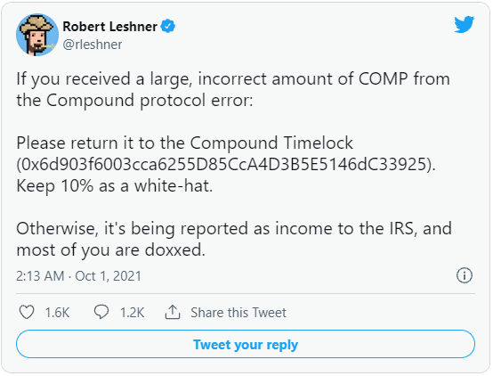 "Pokud jste v důsledku chyby protokolu Compound obdrželi velké, nesprávné množství COMP: Robert Leshner, zakladatel společnosti Compound Labs, napsal ve čtvrtek pozdě večer na Twitteru. "Ponechte si 10 %. V opačném případě (pokud krypto nevrátíte) bude to nahlášeno jako příjem na daňovém úřadě a většina bude doxnuta.