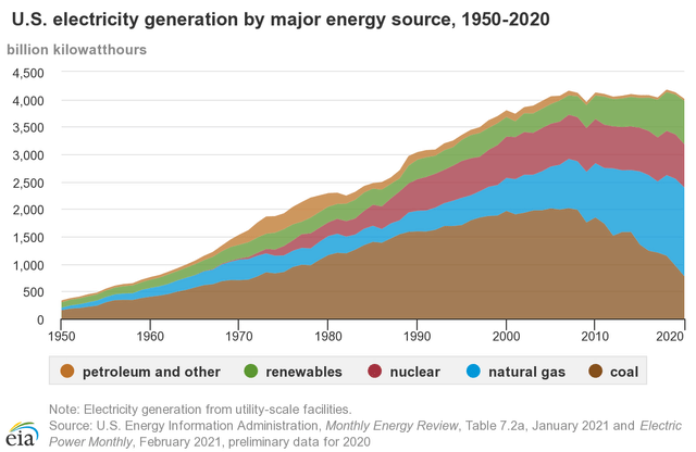 Zemní plyn nadále roste, protože se stává stále oblíbenější variantou "ekologičtější" výroby elektřiny. Jak je vidět výše, v podstatě absorboval všechny výpadky způsobené snížením produkce uhlí.
