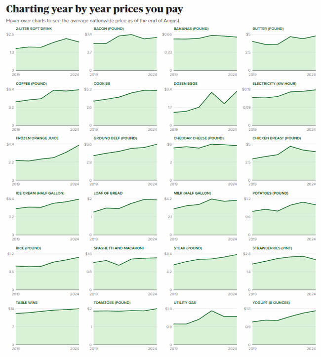 Tento obrázek znázorňuje vývoj cen jednotlivých položek, zejména potravin, za posledních 12 měsíců.