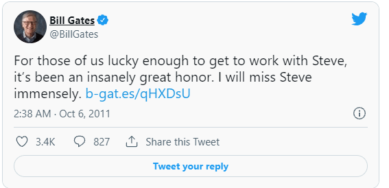 Po Jobsově smrti Gates napsal na Twitter: "Pro ty z nás, kteří měli to štěstí a mohli se Stevem pracovat, to byla šíleně velká čest. Steve mi bude nesmírně chybět."