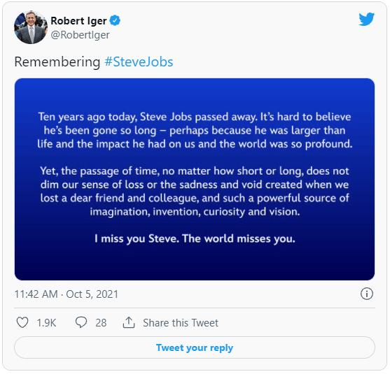 V úterý Iger vzpomněl na přesvědčivou a tvůrčí sílu svého dlouholetého přítele a napsal: "Uplynulý čas, bez ohledu na to, jak krátký nebo dlouhý, neztlumí náš pocit ztráty ani smutek a prázdnotu, která vznikla, když jsme ztratili drahého přítele a kolegu a tak mocný zdroj představivosti, invence, zvědavosti a vize."