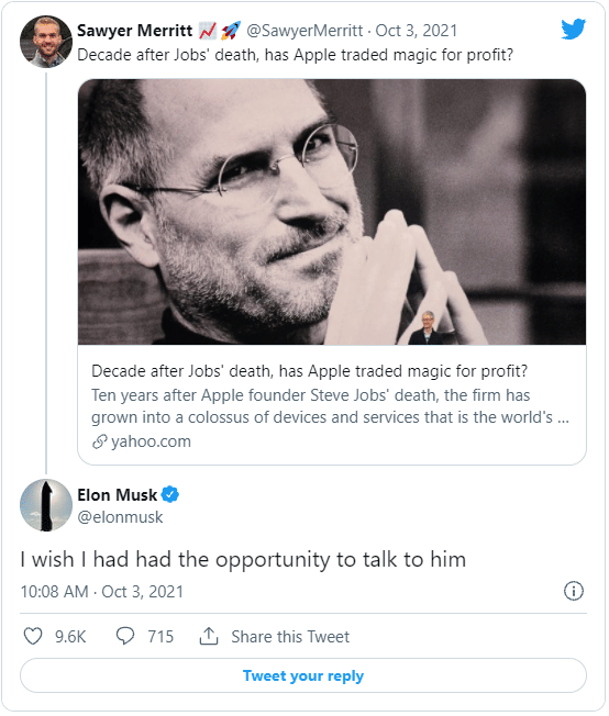 Musk, který bývá někdy přirovnáván k Jobsovi pro své vize budoucnosti, v rozhovoru pro Autobild.tv v roce 2018 řekl, že Jobse dlouho obdivoval.