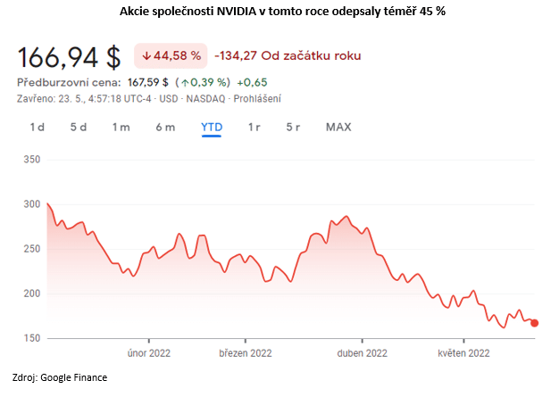 Po úspěšném období na trzích v covidové pandemii, kdy akcie $NVDA vzkvétaly společně s vysokou poptávkou, kvůli pravidelným lockdownům, přichází na společnost negativní dopady, které se vážou na trvající válku na Ukrajině, neboť ta poslala akcie všech společností do medvědího trhu. Po důkladné analýze toho opět mohou využít investoři k nákupu do svého portfolia. V tomto roce $NVDA na trzích odepsala téměř 45 %.