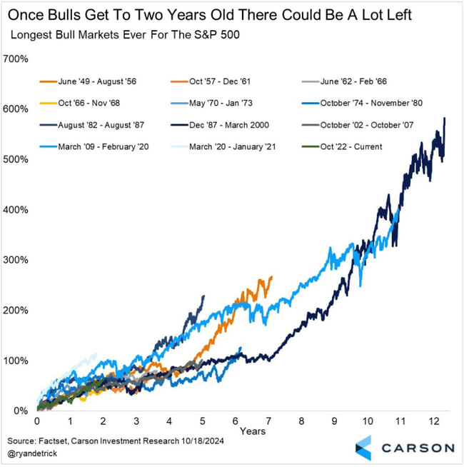 "Když je S&P 500 v růstovém módu alespoň 2 roky, často v něm zůstane dlouhé roky. Nejdelší období zisků bylo zaznamenáno po finanční krizi v roce 2009 a před prasknutím dotcom bubliny v roce 2000. V říjnu S&P 500 oslavil 2 roky v býčí náladě, za tu dobu připisuje přes 40 %. Nejde ale o nic nového. To, že trhy v dlouhodobém horizontu rostou, je známá věc." 🥳🥳🥳