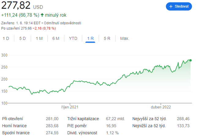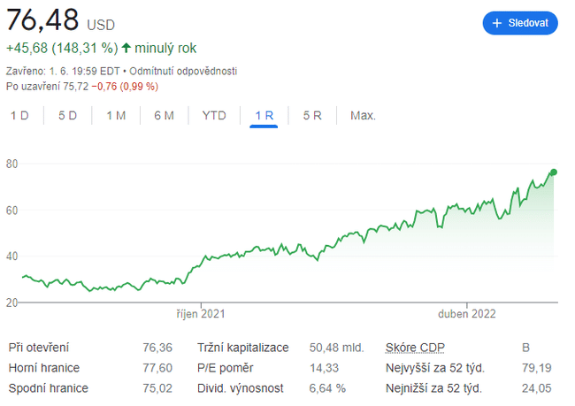 Pokud jde o zisk, společnost Devon dosáhla v prvním čtvrtletí letošního roku čistého zisku ve výši 1 miliardy USD. USD na zředěnou akcii, což představovalo šesté po sobě jdoucí čtvrtletí postupného růstu. Provozní cash flow společnosti vzrostlo v prvním čtvrtletí o 14 % a poskytlo rekordní volný peněžní tok ve výši 1,3 miliardy dolarů. Vzhledem k tomu všemu není divu, že akcie společnosti Devon neustále rostou. Za posledních 12 měsíců přinesly akcie společnosti výnos 165 %.