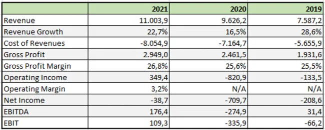 Níže vidíme některé klíčové finanční ukazatele společnosti Spotify za poslední tři roky. První věc, která nás napadne, je, že se jim každoročně dařilo zvyšovat tržby, což je vždy příjemné vidět. Hrubá zisková marže mě příliš nenadchla, ale je hezké vidět, že meziročně roste.