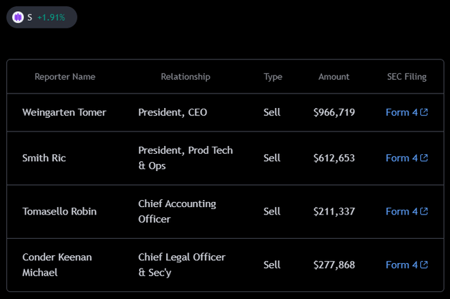 Ne vždy musí být prodej akcií představenstva společnosti negativní zprávou pro drobné investory, proto tuto informaci beru jen okrajově a nejen u tohoto titulu, uvádím jen pro příklad: $S SentinelOne, Inc., kterou tedy aktuálně sleduji a i jsem něco málo přidal do PTF.