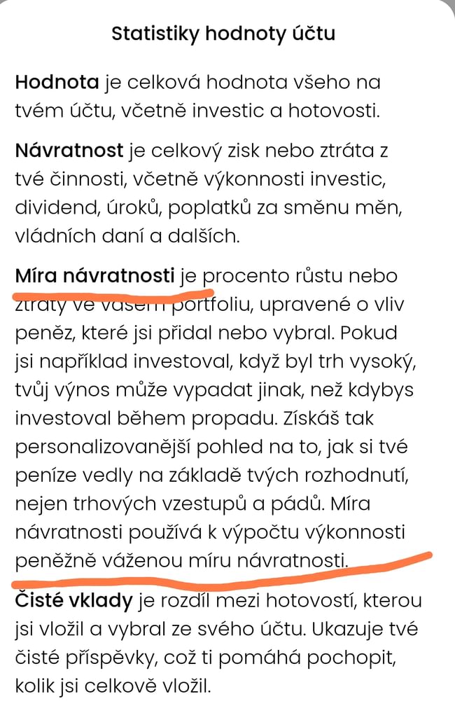Je to fajn, ale upřímně bych uvítal možnost volit si jakou metriku tam chci vidět (nebo vidět obě). Když se o investicích bavím s lidmi co se v tom tolik nepohybují, tak jim budu těžko vysvětlovat "Rate of return". Navíc mě samotného taky občas prostě zajímá o kolik % jsem nahoře.